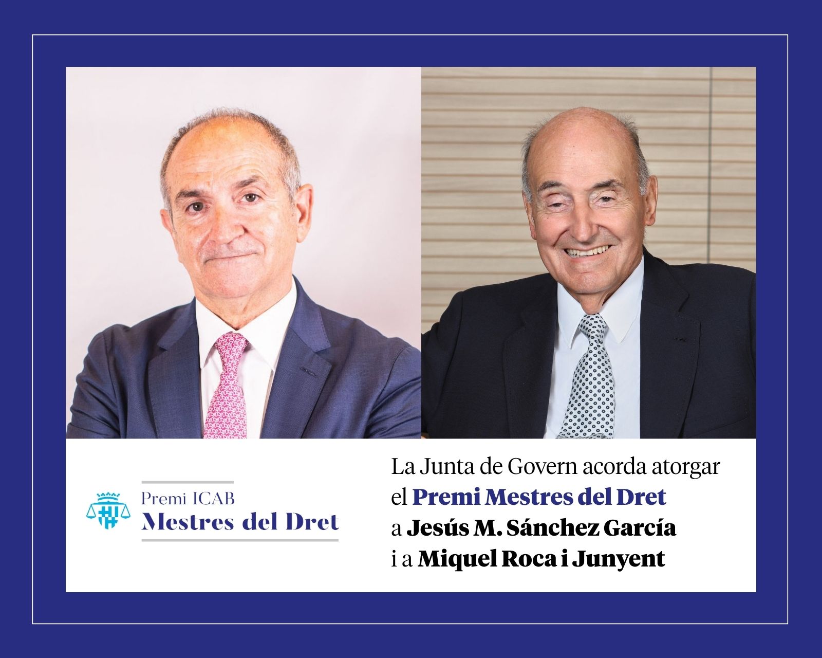 En la reunió celebrada el 19 de novembre de 2025, la Junta de Govern del Col·legi de l’Advocacia de Barcelona ha acordat atorgar el Premi Mestres del Dret a Jesús M. Sánchez García i a Miquel Roca i Junyent, en reconeixement de la seva trajectòria i aportació a l’advocacia.