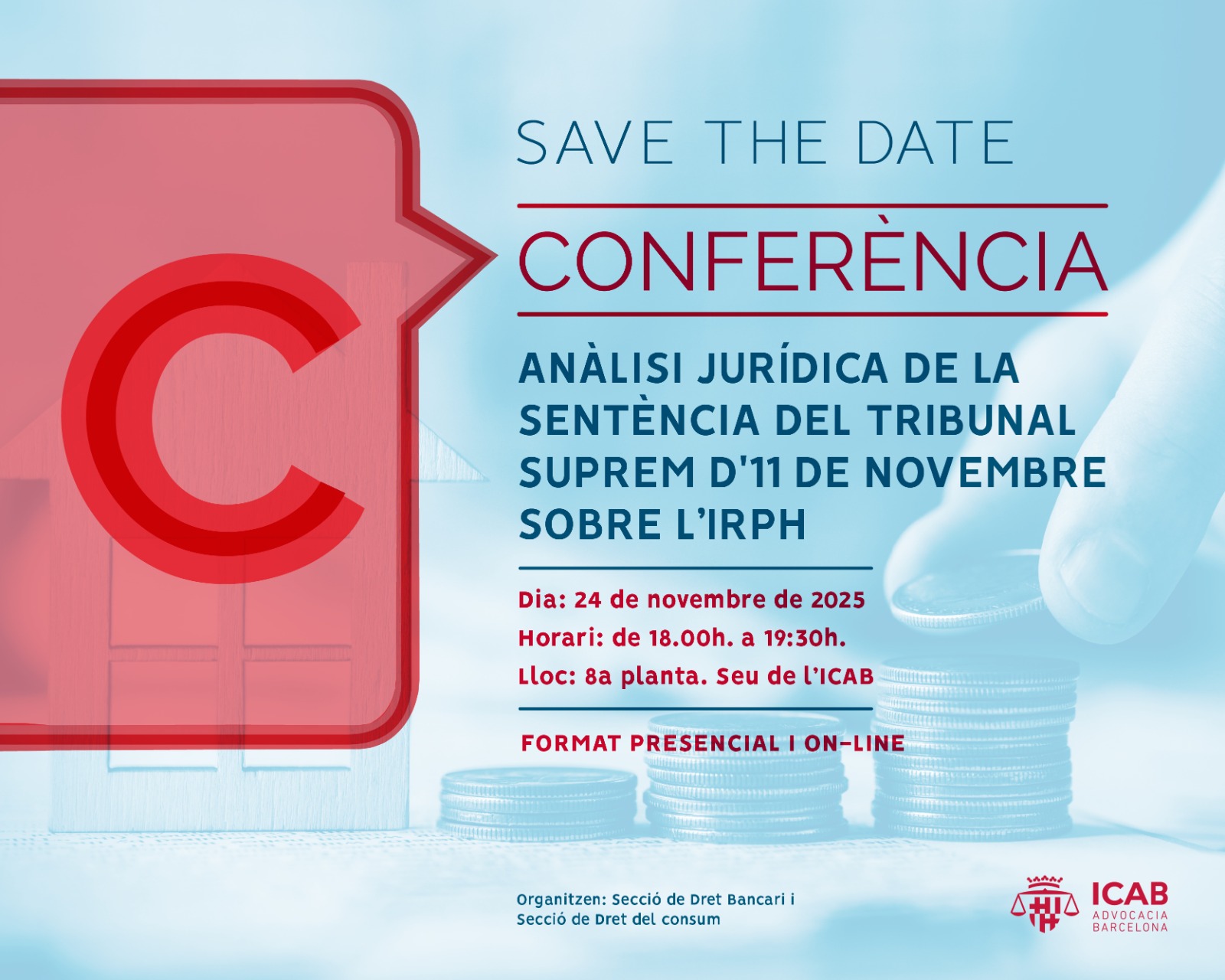El dia 24 de novembre de 2025, a les 18h, la Secció de Dret Bancari i la Secció de Dret de Consum de l'ICAB organitza la conferència per analitzar la sentència del Tribunal Suprem d'11 de novembre sobre l'IRPH.