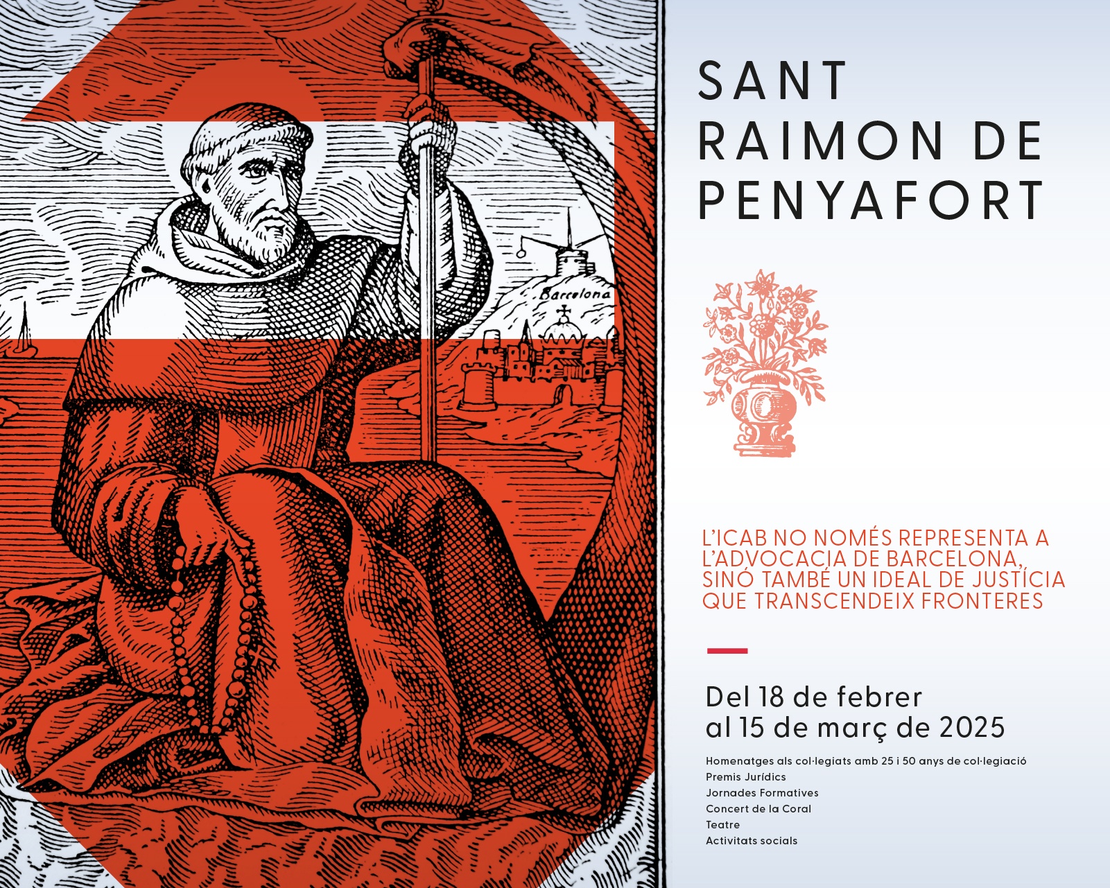 Del 18 de febrer al 15 de març de 2025 se celebrarà l’esdeveniment més important de l'Il·lustre Col·legi de l’Advocacia de Barcelona (ICAB): la festivitat de Sant Raimon de Penyafort, que enguany integra un programa carregat d’actes i novetats importants! Consulteu-lo a http://www.santraimon.cat!