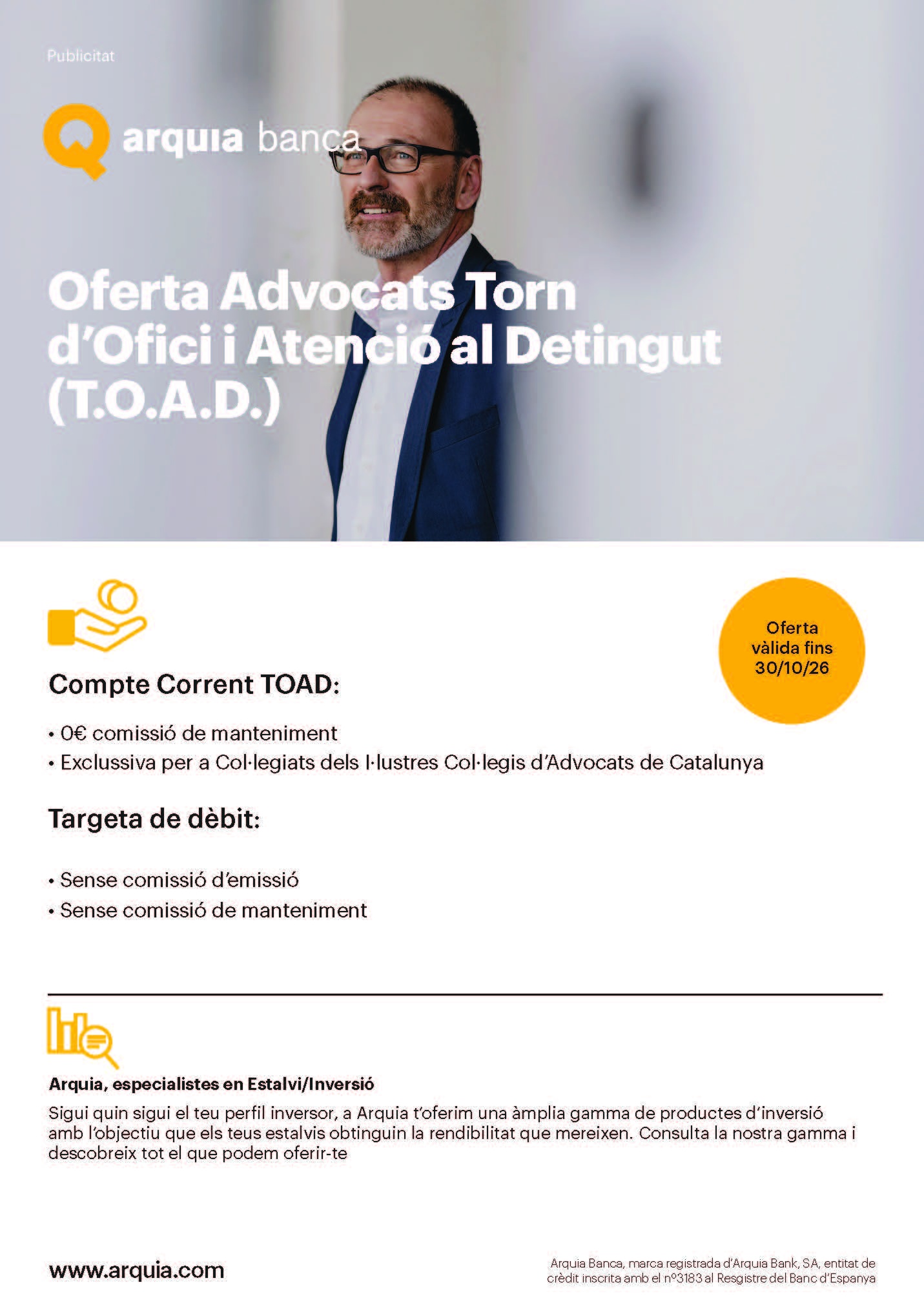 El Ilustre Colegio de la Abogacía de Barcelona (ICAB) ha llegado a un acuerdo con Arquia Banca, entidad financiera especialista en fondos de inversión y en productos y servicios orientados a profesionales, específico para toda la Abogacía de Oficio: la cuenta corriente TOAD.