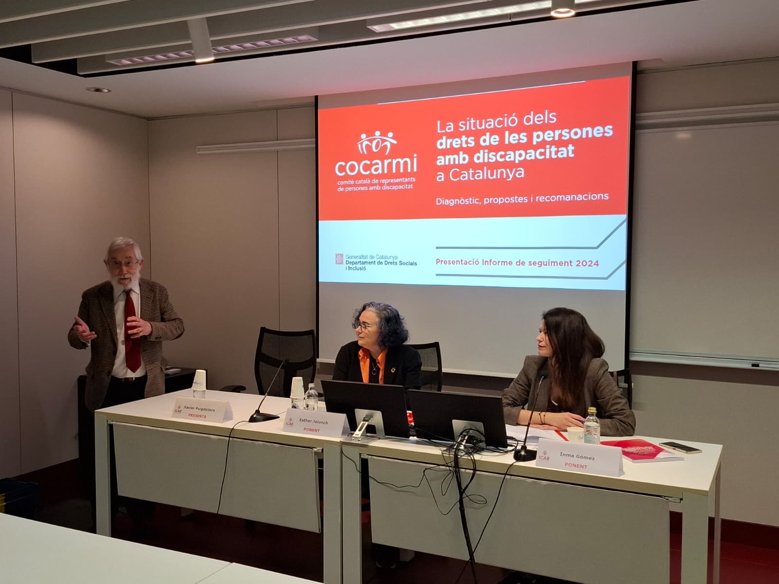 Durante la sesión han intervenido Mercè Batlle, presidenta de COCARMI; Esther Jolonch, vocal de su junta; e Inma Gómez, directora técnica, quienes han expuesto la situación de los derechos de las personas con discapacidad en Catalunya, con diagnóstico, propuestas y recomendaciones.