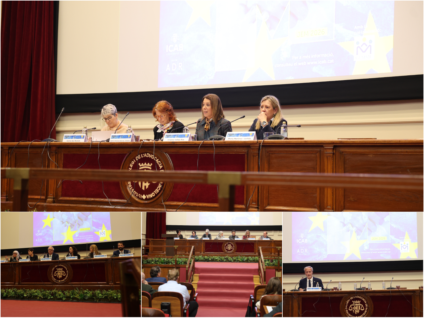 La inaugurado la jornada Cristina Vallejo, decana del Ilustre Colegio de la Abogacía de Barcelona; Esther Giménez-Salinas, Síndica de Greuges de Catalunya; Carme Guil, presidenta de GEMME España; y Marta Martínez i Gellida, presidenta de la Comisión de Mediación y ADR del Consell de l’Advocacia Catalana.