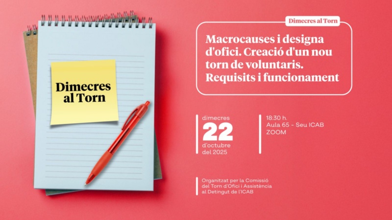 Tendrá lugar el día 22 de octubre de 2025, a las 18.30 h, organizado por la Comisión de Turno de Oficio y Asistencia a la Persona Detenida del ICAB en doble formato (presencial y on-line).
